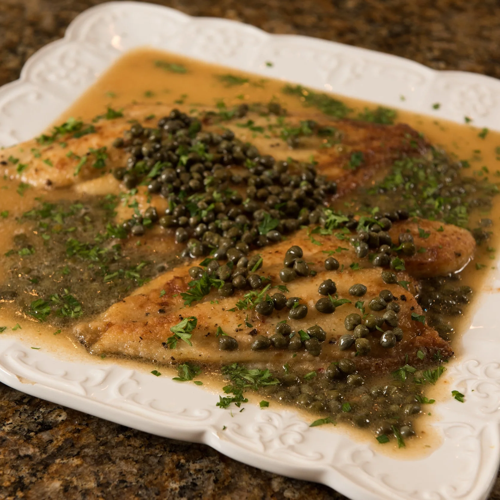 Remove fish to serving platter. Turn off heat. Into hot skillet, whisk in additional tablespoon of butter. Add lemon juice. Pour in capers, juice and all. Whisk until blended. Pour thin sauce over fish fillets. Garnish with chopped parsley. Serve at once.